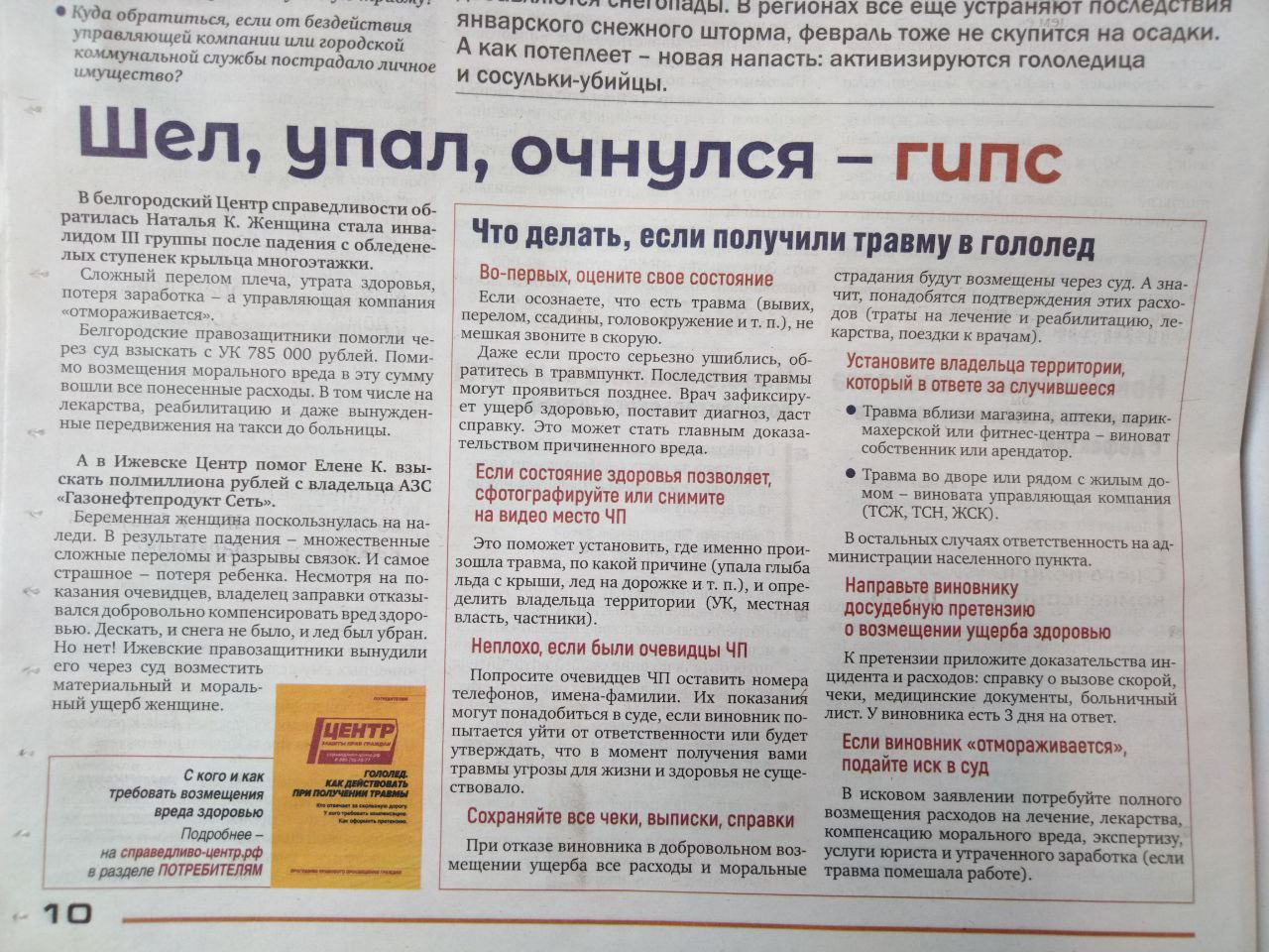 Почему этот номер нужно прочитать особенно внимательно? Главная статья выпуска называется "Шел, упал, очнулся, гипс". Знакомая фраза? Увы, этой зимой многие иркутяне испытали ее на себе, когда город оказался во власти снежных заносов, а тротуары превратились в полосу препятствий. В материале разбираем, кто виноват и, главное, что делать, если вы пострадали от гололеда или плохой уборки территории. Как заставить чиновников и управляющие компании отвечать рублем за наш травматизм.